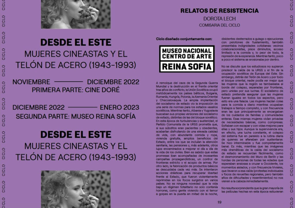 “Eshtë fakt që filmat e realizuar nga gratë kineaste të Evropës Lindore në periudhën ndërmjet Luftës së Dytë Botërore dhe rënies së Bashkimit Sovjetik, nuk janë të shumtë në numër, megjithatë, historitë e grave në të gjithë ato vite janë të panumërta. Ky cikël, “Nga Lindja: Gratë kineaste dhe Perdja e Hekurt (1943-1993)”, është një udhëtim në veprat e dhjetë grave kineaste midis viteve 1943 dhe 1993 nga vende si Shqipëria, Gjeorgjia, Letonia Ukraina, etj, dhe përfshin emra regjisoresh po aq të shquara sa Kira Muratova, Binka Zhelyazkova, Márta Mészáros, Věra Chytilová e Larisa Shepitko. Disa prej tyre, deri më sot të paprezantuara në sallat spanjolle e të panjohura për publikun spanjoll. Duke mbuluar një gamë kaleidoskopike qasjesh, nga satira absurde deri te guximi formal i avangardës, ky cikël tregon se filmi ka qenë prej kohësh një shprehje e rezistencës. Këto filma ofrojnë jo vetëm pamje të përditshmërisë të jetës së grave në këtë kohë, po tregojnë edhe botën krijuese që jetonin këto kineaste, duke nënvizuar guximin dhe talentin e artisteve të cilat u përpoqën t’i jetësonin vizionet e tyre përpara pengesave të panumërta, të dukshme dhe të padukshme. Filmat e përzgjedhur janë të ndryshëm dhe tregojnë dhe riimagjinojnë histori personale dhe kolektive. Qoftë duke thirrur të kaluarën apo duke spekuluar për të ardhmen, të gjitha ato janë një zgjatim i botës dhe vizioni i krijuesit. Ky cikël ofron një plejadë të filmave që portretizojnë gjatë gjithë kohës jetën në vendet, rajonet, periudhat kohore dhe klasat, por është e rëndësishme të theksohet se, edhe pse veprat në këtë cikël janë të pasura dhe zbuluese, ato nuk mbulojnë më shumë se një pjesë të tregimeve të kësaj periudhe. Si pasojë, ai nuk pretendon të flasë për tërësinë të përvojave të grave gjatë këtyre viteve. Rrëfimet individuale të fitores, humbjes, triumfit dhe tmerrit të dëgjuara në tavolina, në shtëpi, në rradhët e tregut, gjithashtu meritojnë të tregohen, dhe ruajtja e këtyre artefakteve të historisë sonë të përbashkët është thelbësore për riprogramimin e hierarkisë të imazheve, të cilat tradicionalisht braktisin perspektivat e shtypura. Historitë që kanë mbijetuar janë më shumë se pëshpëritje të mbijetesës sonë të përbashkët.