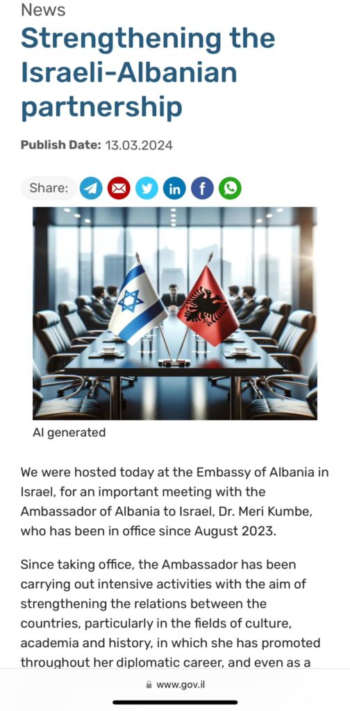 Ambasadorja e Shqipërisë në Izrael Meri Kumbe pati kënaqësinë të mirëpres në Ambasadën e Republikës së Shqipërisë, Drejtorin e Përgjithshëm të Ministrisë së Bashkëpunimit Rajonal të Izraelit, z. Gilad Shadon dhe ekipin e tij. Duke diskutuar për marrëdhëniet e veçanta historike mes Shqipërisë dhe Izraelit, diskutuam për mundësitë e thellimit të marrëdhënieve dypalëshe midis vendeve tona 🇦🇱🤝🇮🇱.