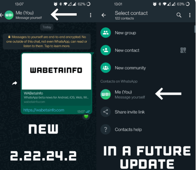 Kjo veçori e re u vu re në versionin beta të WhatsApp v2.22.24.2 të aplikacionit Android . Për më tepër, WABetaInfo gjithashtu vuri në dukje se disa përdorues të përzgjedhur tashmë po marrin akses për të provuar veçorinë “Mesazhi vetë”. Në këtë, WhatsApp ka shtuar një opsion chat ‘Unë (Ti)’ për të dërguar mesazhe për veten tuaj.