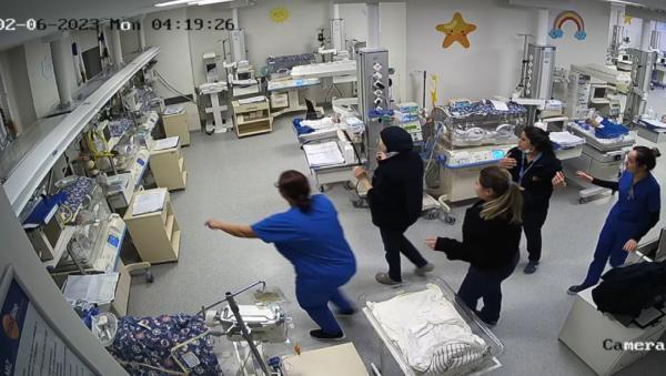 Në pamjet e pasqyruara në kamerën e sigurisë, shihen se si infermieret e spitalit në vend që të dalin jashtë godinës, vrapuan drejt dhomave për të “përqafuar” inkubatorët duke mos i lënë ato të rrëzohen në tokë.