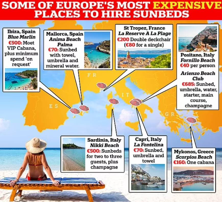 Ai thotë se klubet e mbyllura në destinacionet italiane të Capri, Sardenjës dhe Positano dhe vendpushimet spanjolle të Majorca dhe Ibiza paguajnë deri në 685 € për një vend në diell.