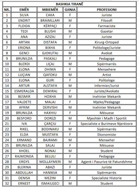 Në listë siç shihet ka ish-gazetarë, farmacistë, politologë, avokatë etj. Ish-deputetët Silva Caka, Endrit Braimllari dhe Floida Kërpaçi kryesojnë listën e emrave si kandidatë për Këshillin Bashkiak të Tiranës.
