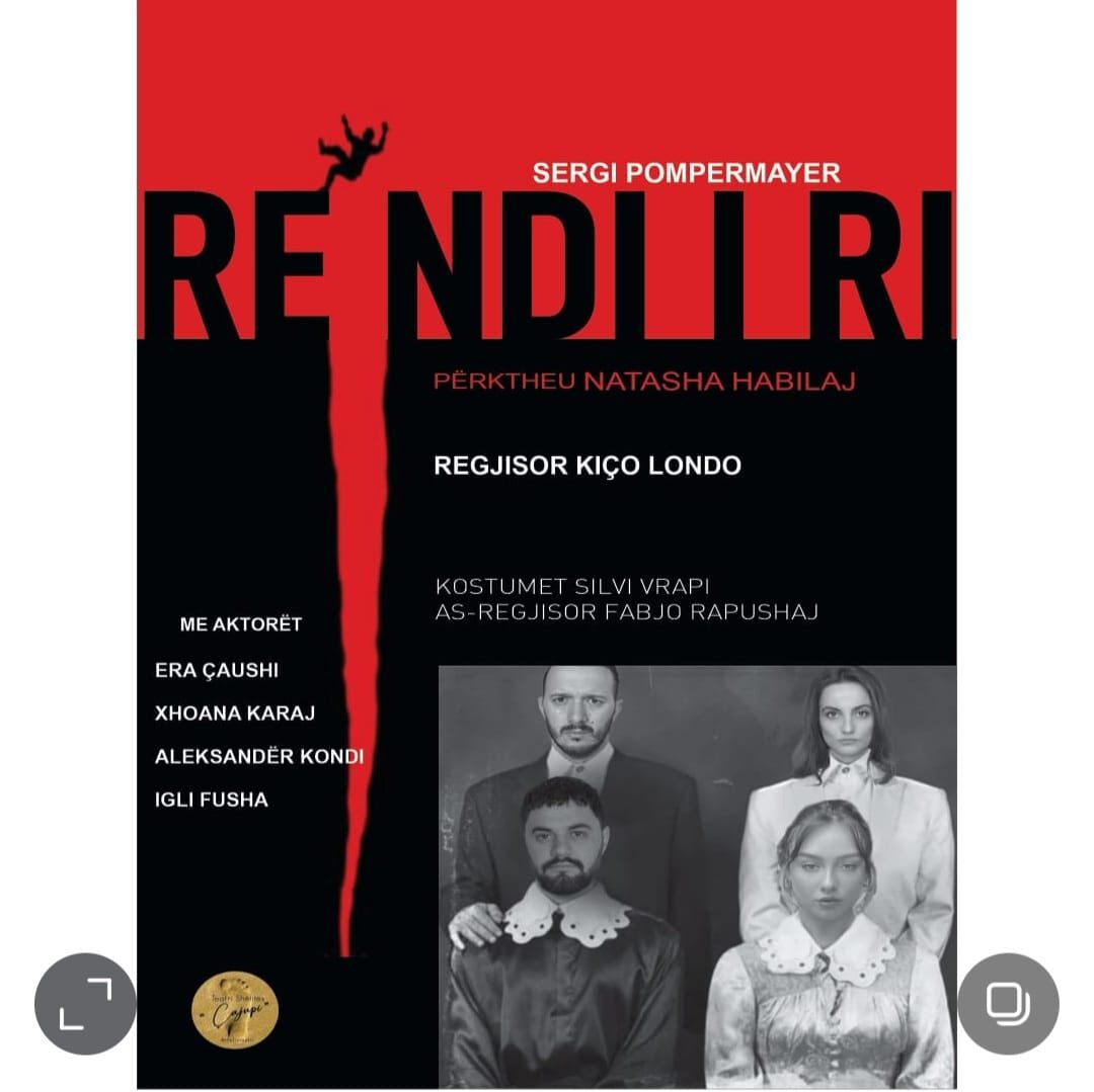 “Rendi i ri” shfaqja e re teatrore nga regjisori Kiço Londo vjen premierë në teatrin “Zihni Sako” të Gjirokastrës. Drama “Rendi i ri” e autorit spanjoll Sergi Pompermayer e shkruar në vitin 2014, ku ngjarja zhvillohet në një repart të braktisur autopsie dhe ka në qendër disa rrëmbyes e dy të rrëmbyera (nënë e bijë) do të jetë në skenë në datat 2 dhe 3 tetor në Gjirokastër. Shfaqja vjen në skenë si produksion i Teatrit Shëtitës “Çajupi”, që udhëhiqet nga regjisori Kiço Londo. Shfaqja vjen në skenën teatrore në Gjirokastër nga një ekip teatror, që ka në përbërjen e tij talente të reja të spikatura për brezin e tanishëm. Në rolet e veprës janë aktorët Era Çaushi, Xhoana Karaj, Aleksandër Kondi dhe Igli Fusha.