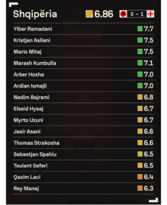 Ndërkohë për sa i përket vlerësimeve të “Sofa Score”, futbollisti me notën më të lartë rezulton Ylber Ramadani, 7.7, ndërkohë që Asllani dhe Mitaj plotësojnë “podiumin”. Lojtarët më pak të vlerësuar sipas “Sofa Score” janë Manaj dhe Laçi.