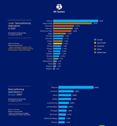 Organizata Botërore e Turizmit e Kombeve të Bashkuara e ka renditur Shqipërinë në vendin e parë si destinacionin me rritjen më të lartë të numrit të turistëve përgjatë vitit 2024.