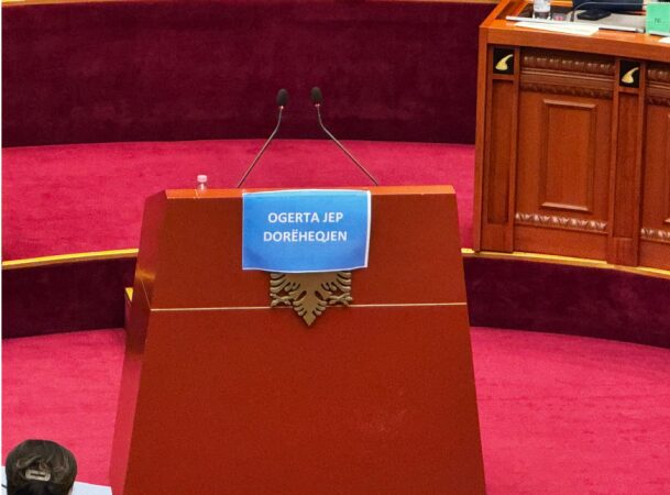 Deputetja e PD-së, Ina Zhupa vendosi një pankartë me nënshkrimin “Ogerta jep dorëheqjen” (referuar ministres së Arsimit, Ogerta Manastirliu), në foltoren e Kuvendit.