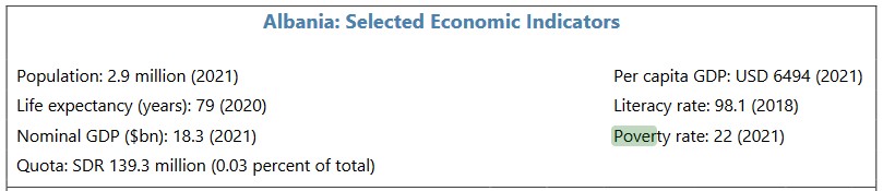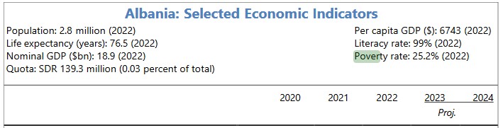Shqipëria po rezulton një nga vendet me ecurinë më të mirë ekonomike në rajon, sa u përket shifrave dhe rezistente ndaj goditjeve të ndryshme si tërmeti, pandemia, apo lufta, por kjo ecuri nuk duket se ka ndikuar në përmirësimin e jetesës së qytetarëve të saj. Të dhënat e Fondit Monetar Ndërkombëtar (FMN) të publikuara në staf raportin e fundit për konsultimin e artikullit IV për vitin 2023, bënë të ditur se varfëria në vend është rritur vitet e fundit.