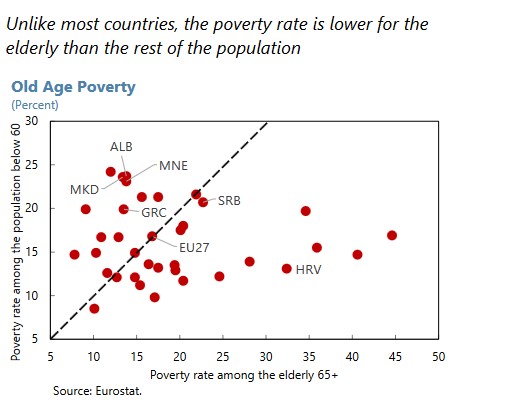 Sipas FMN-së, ndryshe nga shumë vende, norma e varfërisë në Shqipëri është më e ulët tek të moshuarit, në krahasim me pjesën tjetër të popullsisë.