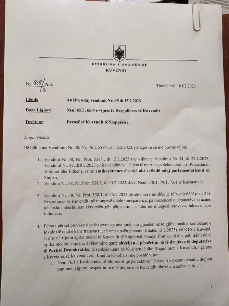 Deputetët e PD kanë paraqitur kërkesë për ankimim në Byronë e Kuvendit për vendimin për përjashtimin e deputetëve.
