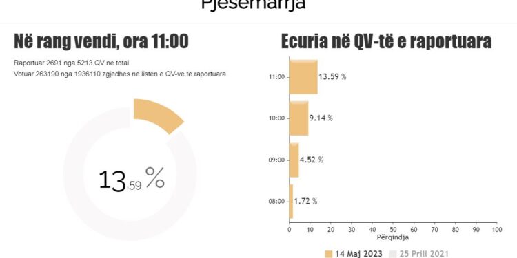 Deri në orën 11:00 kanë marrë pjesë 13.59% e votuesve nga raportimet që janë bërë nga 2691 nga 5213 QV në total.