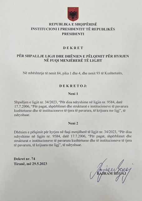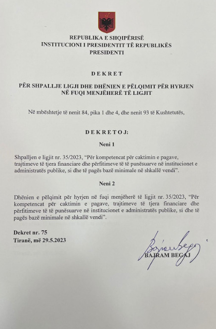 Presidenti i Republikës Bajram Begaj ka dekretuar këtë të Hënë projektligjin për rritjen e pagave.Presidenca në një njoftim zyrtar shkruan: Të nderuar, referuar interesit të medias mbi dekretimin nga ana e Presidentit të Republikës Sh.T.Z Bajram Begaj të paketës së plotë të reformës së pagave, më poshtë gjeni të firmosura ditën e sotme 3 dekretet përkatëse:
