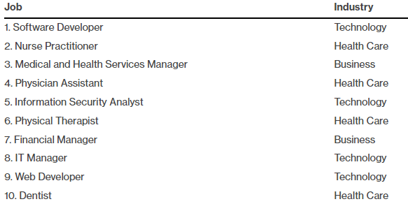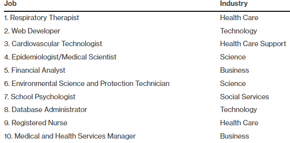 US News analizoi të dhënat nga Byroja e Statistikave të Punës për të renditur vendet e punës duke punësuar kërkesën, rritjen, pagën mesatare, shkallën e punësimit, perspektivat e ardhshme të punës, nivelin e stresit dhe balancën punë-jetë.