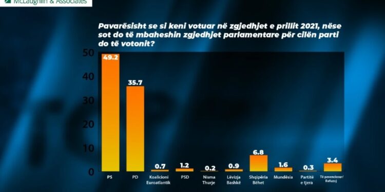 Një sondazh i ri i kryer nga McLaughlin & Associates në bashkëpunim me Top Channel dhe i publikuar në emisionin Top Story me Grida Dumën ka treguar tendencat aktuale të votuesve shqiptarë nëse zgjedhjet parlamentare do të mbaheshin sot.
