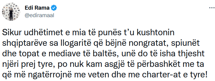 Përmes një postimi në Twitter, Rama shprehet se avioni që ai përdor në udhëtime pune nuk është një charter komercial, po një avion për të cilin është akuzuar edhe më parë, dhe se shpenzimet janë brenda buxhetit të qeverisë.