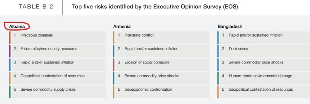 Sëmundjet infektive dhe mangësia në infrastrukturën për tu mbrojtur nga sulmet kibernetike janë dy shqetësimet kryesore të drejtuesve ekzekutivë shqiptarë sipas raportit të fundit të Forumit Ekonomik Global, që ka identifikuar rreziqet kryesore globale për vitin 2023 në raportin e tij të fundit “Raporti i rreziqeve globale 2023”.