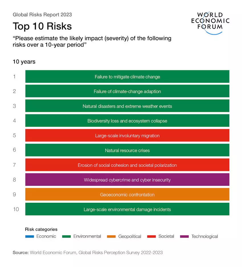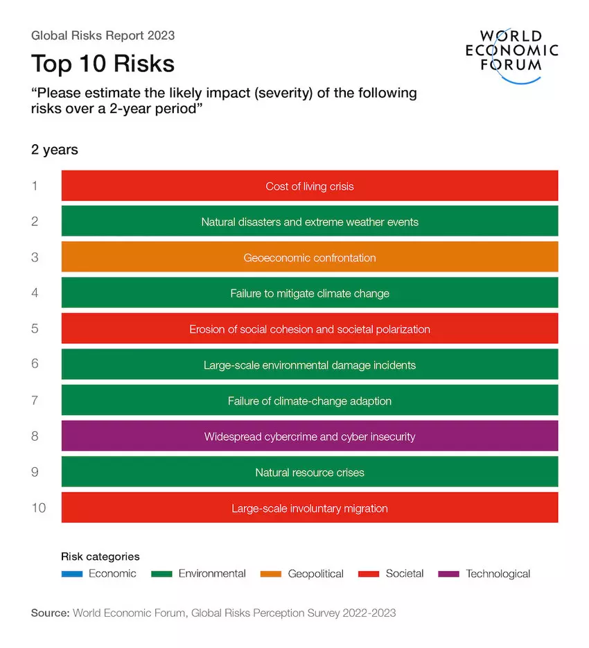 Raporti e përshkroi krizën e kostos së jetesës si “rrezikun më të madh në terma afatshkurtër” deri në vitin 2025, e ndjekur nga fatkeqësitë natyrore, ngjarjet ekstreme të motit dhe “përplasja gjeoekonomike”.