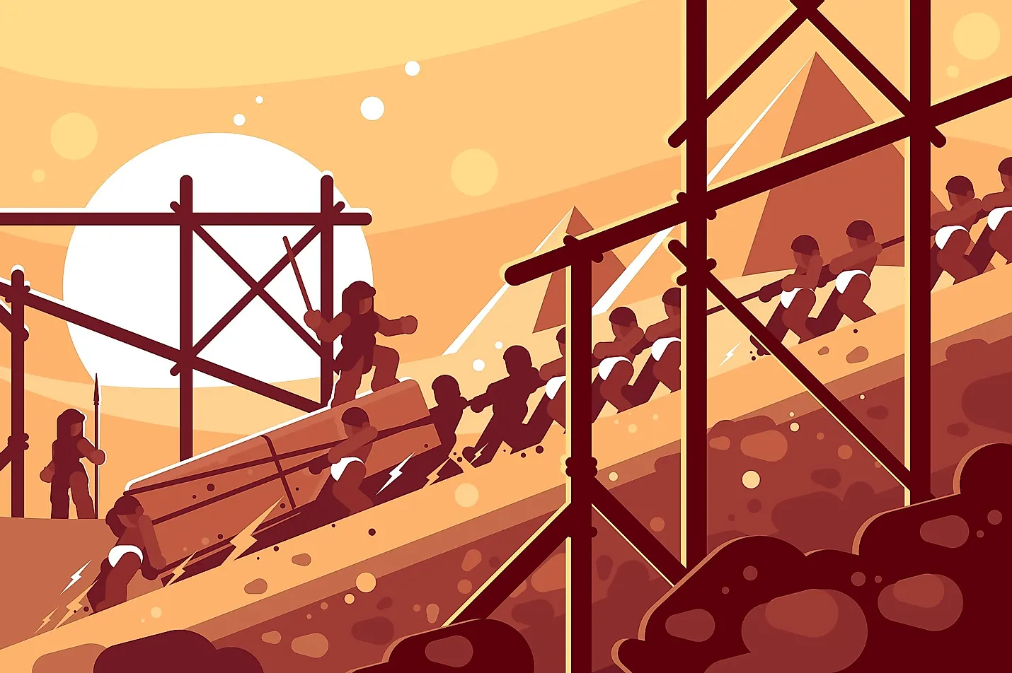 Interpretimet e famshme moderne i kanë lënë botës përshtypjen se piramidat janë ndërtuar tërësisht nga njerëz të skllavëruar. Megjithatë, ky besim kundërshtohet nga shumë studiues aktualë. Punëtorët e bujqësisë shpesh ndërtonin vepra të mëdha si katedralet e Evropës pasi sezoni i korrjes dhe mbjelljes kishte përfunduar, dhe kushte të ngjashme mund të kishin dhënë punën e nevojshme për të ndërtuar piramidat. Përmbytjet e rregullta të Nilit do të prishnin përdorimin e tokave bujqësore dhe një zgjidhje ishte të sigurohej punë e rregullt përmes ndërtimit të këtyre varreve masive. Prandaj, bazuar në gjetjet arkeologjike të kushteve të parcelave të varrimit të këtyre punëtorëve, është arritur në përfundimin se ata ishin, në pjesën më të madhe, një klasë punëtorësh të aftë.