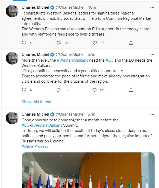 “Përgëzoj liderët e Ballkanit Perëndimor për nënshkrimin e tre marrëveshjeve rajonale mbi lëvizshmërinë sot që do të ndihmojnë në kthimin e tregut të përbashkët rajonal në realitet. Ballkani Perëndimor mund të mbështetet gjithashtu në mbështetjen e BE-së në sektorin e energjisë dhe me përforcimin e qëndrueshmërisë ndaj kërcënimeve hibride”, ka thënë ai.
