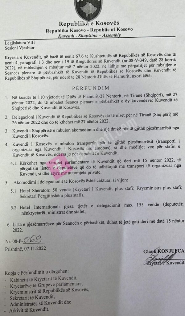 “Hotel Sheraton: 50 vende (Kryetari i Kuvendit plus stafi, Kryeministri plus stafi, Sekretari i Përgjithshëm plus stafi). Hotel International: pjesa tjetër e delegacionit max 155 vende (deputetët; nënkryetarët; ministrat dhe stafet),”- thuhet në dokumentin e nënshkruar nga kryeparlamentari Konjufca.