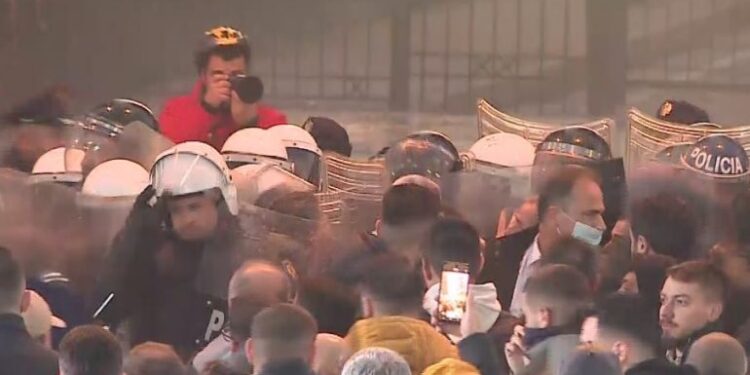 Nderkohe qe vijojnë tensionet ku protestuesit tentojnë të çajnë kordonin e policisë, por ka përplasje mes tyre dhe efektivëve të FNSH.