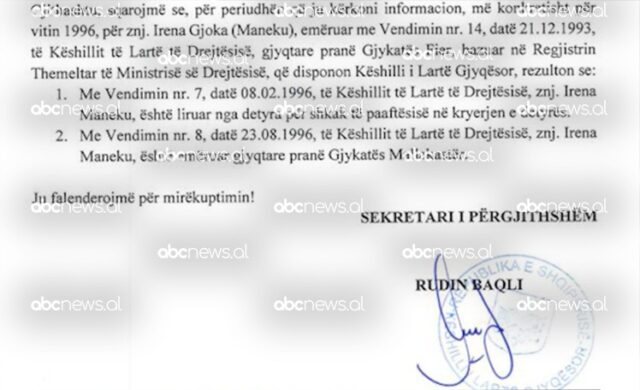 Avokatët kërkuan kohë për shqyrtimin e dokumentave ndërsa kërkuan përjashtimin e gjyqtares Irena Gjoka, me pretendimin se është shkarkuar si gjyqtare nga Berisha kur ishte president, por në një shkresë që disponon ABC News tregon se Berisha e ka riemëruar pas 6 muajsh gjyqtare në Gjirokastër.