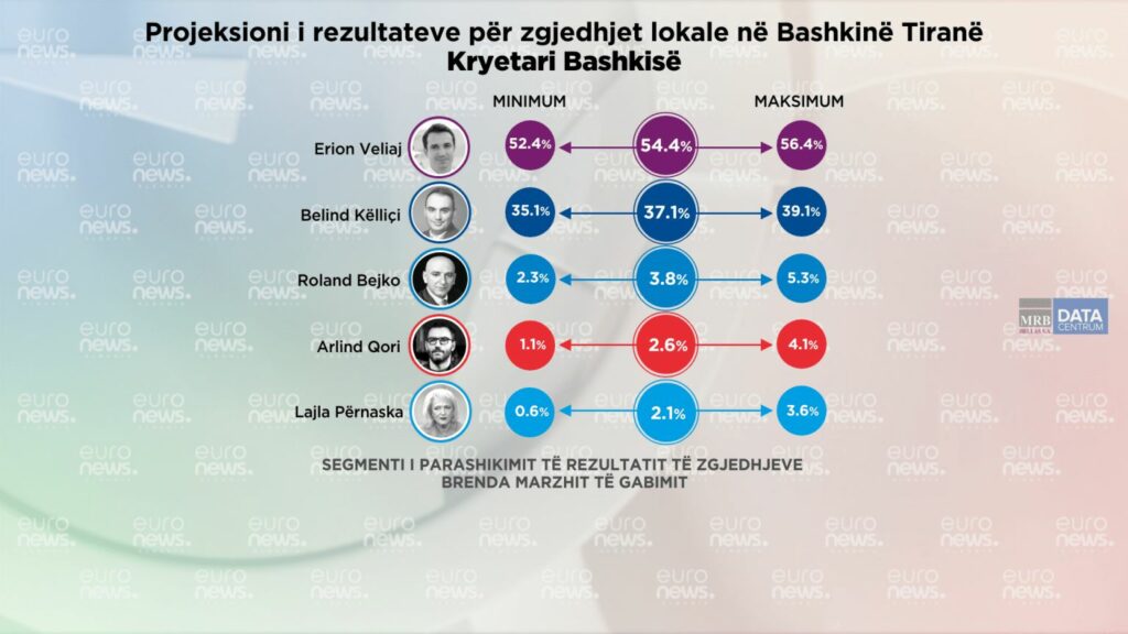 Erion Veliaj fiton thellë në Tiranë. Sipas sondazheve të publikuar nga Euronews, Erion Veliaj do të marrë 54.4% të votave (marzhi i gabimit të sondazhit është +/- 2%).