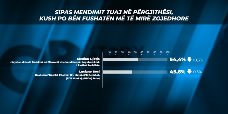 E nëse zgjedhjet e 14 majit do të zhvillohen ditën e nesërme, 57.9% e qytetarëve në Elbasan kanë shprehur vullnet për të votuar përfaqësuesin e majtë Gledian Llatja, ndërsa 42.1% e tyre shprehen se do t’i japin votën Luçiano Boçit.