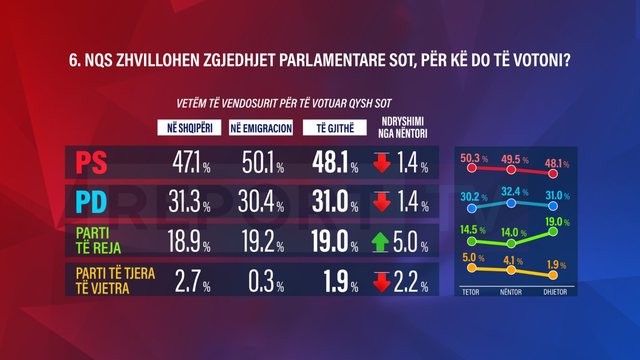 Ndalur vetëm tek zgjedhësit në diasporë, 50.1% do zgjidhnin PS për një mandat të katërt, 30.4% PD, 19.2% parti të reja, 0.3% parti të tjera të vjetra. Ndërkohë, edhe te anketuarit në Shqipëri mandatin e katërt do ia besonin sërish Ramës, me 47.1% të votave, 31.3% PD, 18.9% parti të reja dhe 2.7% parti të tjera të vjetra.