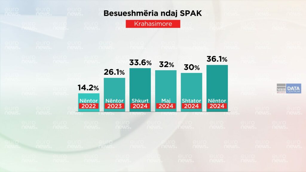Nëse analizojmë shifrat e besueshmërinë në periudha të ndryshme nga 14.2% që ishte besueshmëria për këtë institucion në fillimet e tij, në një vit u dyfishua me 26.1%, u rrit në 33,6% në shkurt të vitit pasardhës, pati një rënie në 32% në maj të 2024 me 32%, edhe një rënie tjetër në shtator të këtij viti me 30% për tu rritur në matjen e fundit në shifrën më të lartë të kësaj periudhe matjesh.