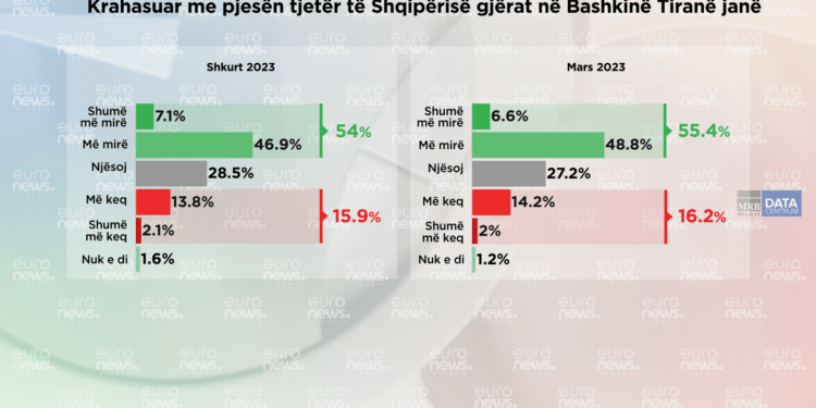 Ndërsa numri i qytetarëve që mendojnë se gjërat në kryeqytet po shkojnë më keq se 5 vite më parë është ulur nga 48.7% që ishte në Shkurt 2023 në 45.3% në muajin Mars 2023.