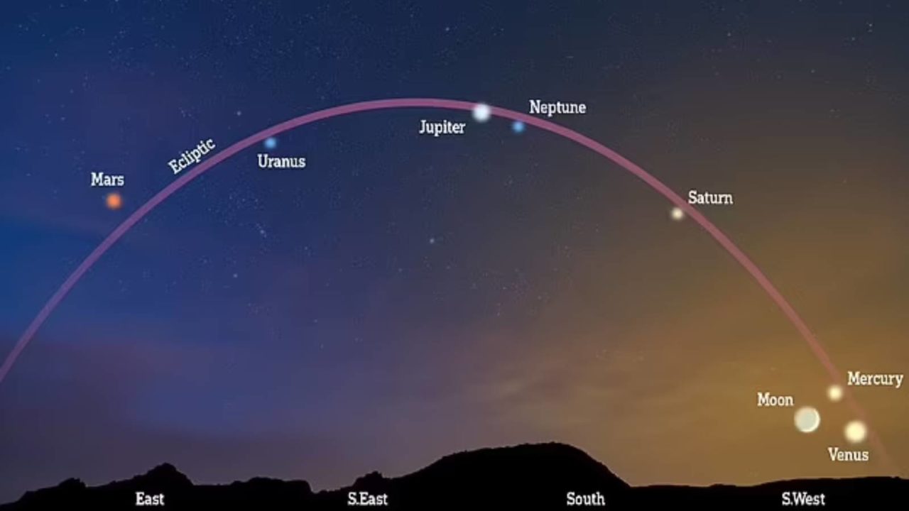 Venusi, Mërkuri, Saturni, Jupiteri dhe Marsi të gjithë mund të shihen sipas radhës me sy të lirë duke nisur nga horizonti jugperëndimor dhe duke lëvizur drejt lindjes.
