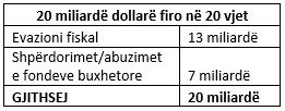 Në 20 vitet e fundit, rreth 13 miliardë dollarë kanë firuar nëpër kanalet dhe kapilarët e evazionit fiskal, gjatë rrugës për në Thesarin e Shtetit. Dhe pasi Thesari i Shtetit ka grumbulluar aq para sa ka mundur, rreth 7 miliardë të tjerë kanë firuar gjatë kryerjes së shpenzimeve buxhetore.