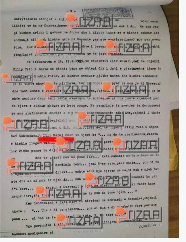 “Objekti Filip Talo është marrë në përpunim paraprak në 23.01.1989 mbi besën e denoncimeve të studentëve Ilir Murati e Ilir Metaj dhe me vërtetësinë e tyre me teknikë operative, më 23.04.1989 është ngritur në përpunim aktiv, ku rezulton se Filip Talo ka tendencë arratisje jashtë shtetit”, shkruhet në dosje.