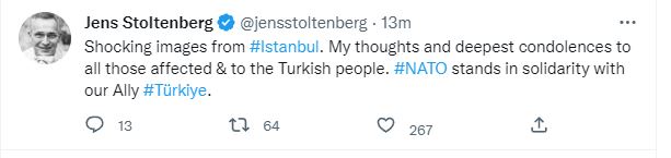 “Pamje tronditëse nga Stambolli. Mendimet e mia dhe ngushëllimet më të thella shkojnë për të gjithë ata që janë prekur dhe për popullin turk. NATO qëndron në solidaritet me aleatin tonë Turqinë”, shkruan Stoltenberg në Twitter.