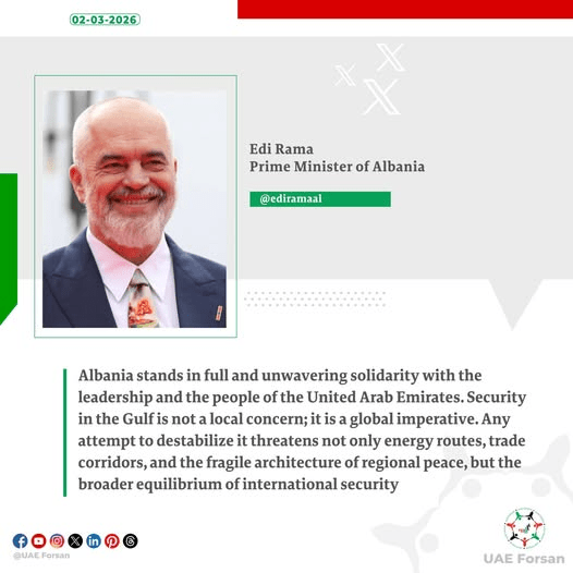 “Shqipëria qëndron në solidaritet të plotë dhe të palëkundur me lidershipin dhe popullin e Emirateve të Bashkuara Arabe. Siguria në Gjirin Persik nuk është një shqetësim lokal, është një imperativ global”, mësohet të ketë deklaruar kryeministri.