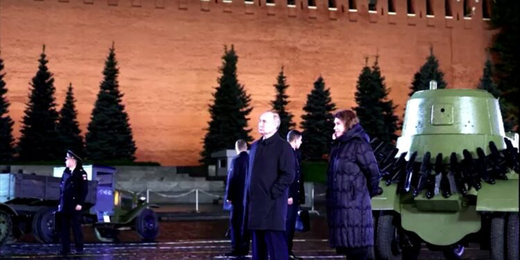 Kreu i Kremlinit pa nga afër armatimet e vjetra dhe përshëndeti ushtarakët e veshur me uniformën e vitit 1941, njësoj si në kohën kur ata marshuan drejt linjave të frontit gjatë Luftës së Dytë Botërore.