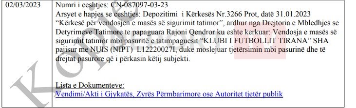 Drejtoria e Tatim Paguesve të Mëdhenj ka vendosur masën e sigurimit tatimor mbi pasuritë e klubit të Tiranës. Kjo për shkak se bardheblutë nuk kanë paguar disa detyrime tatimore. Drejtoria në fjalë më 2 mars ka rregjistruar në Qendrën Kombëtare të Biznesit vendimin për bardheblutë dhe si rrjedhojë nuk mund të kryhet tjetërsimi dhe mbi pasurinë dhe të drejtat pasurore që i përkasin këtij subjekti. Kjo do të thotë se për momentin nuk do të ketë asnjë lëvizje asetesh.