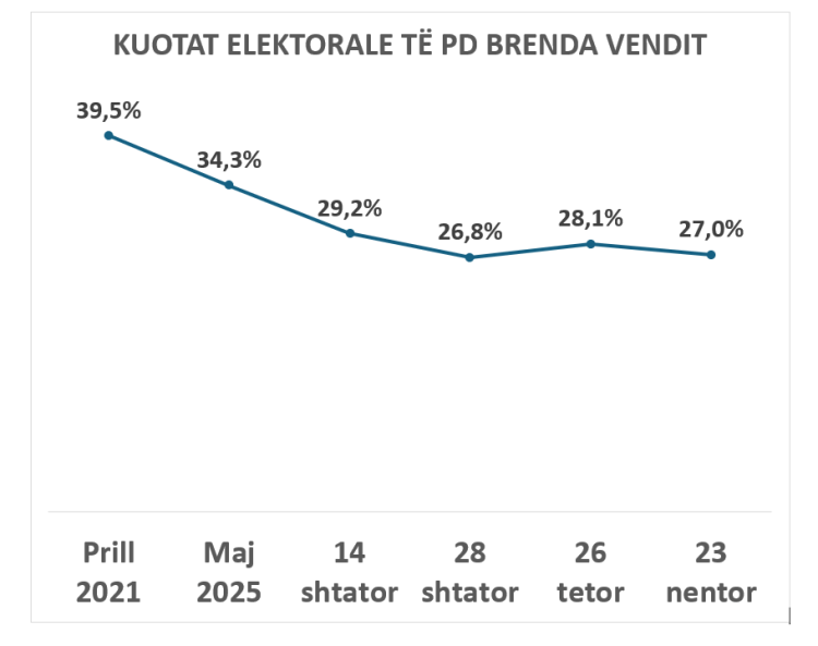 Në fakt, në sondazhin e përjavshëm ‘Zëri i shqiptarëve’ në ABC NEWS, unë e kam matur në vazhdimësi këtë rënie. Duke ndërthurur rezultatet e sondazhit me rezultatet zyrtare të zgjedhjeve në prill 2021 dhe maj 2025, ndërtova grafikun e mëposhtëm, që ilustron rrëshqitjen e pandalshme të kuotave elektorale të PD-së qysh nga prilli 2021.