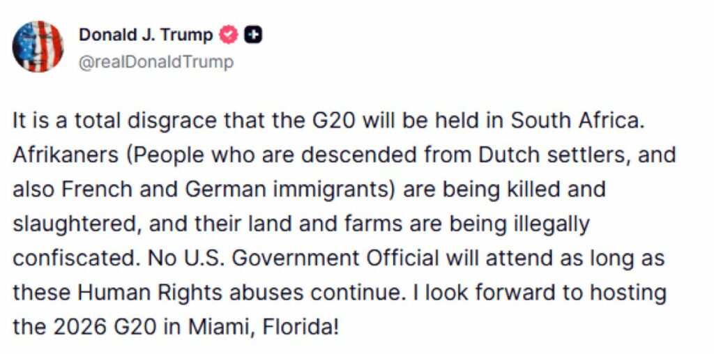 “ ‘Afrikanerët’ (njerëz me prejardhje nga kolonët holandezë dhe gjithashtu emigrantë francezë dhe gjermanë) po vriten dhe masakrohen dhe tokat dhe fermat e tyre po konfiskohen ilegalisht”, shkroi Trump në Truth Social.
