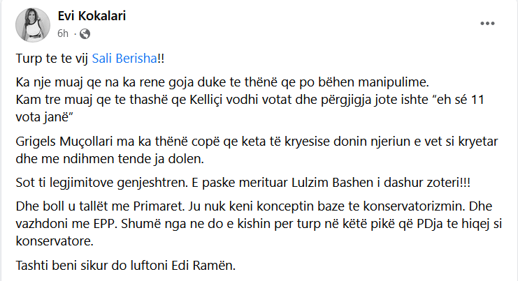 “ Turp te te vij Sali Berisha! Ka një muaj qe na ka rene goja duke te thënë qe po bëhen manipulime. Kam tre muaj qe te thashë qe Këlliçi vodhi votat dhe përgjigja jote ishte “eh sé 11 vota janë”. Grigels Muçollari ma ka thënë copë qe këta të kryesisë donin njeriun e vet si kryetar dhe me ndihmën tende ja dolen. Sot ti legjitimove gënjeshtrën. E paske merituar Lulzim Bashën i dashur zotëri!!!, thuhet në postimin në facebook të zonjës Kokalari.