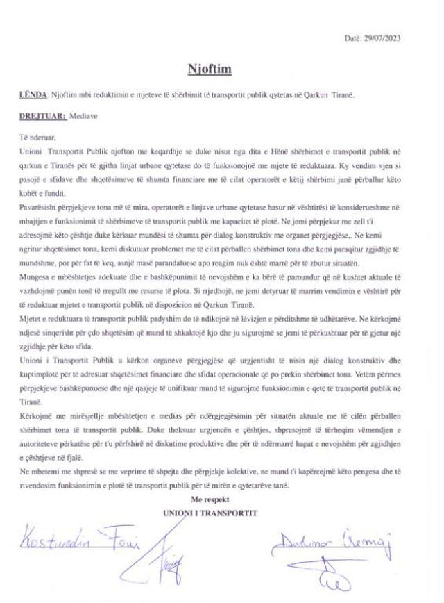 ‘Unioni Transportit Publik njofton me keqardhje se duke nisur nga dita e hënë shërbimet e Transportit publik në qarkun e Tiranës për të gjitha linjat urbane qytetase do të funksionojë me mjete të reduktuara. Ky vendim vjen si pasojë e sfidave dhe e shqetësimeve të shumta financiare me të cilat operatorët e këtij shërbimi janë përballur këto kohët e fundit’- njofton Unioni i Transportit Publik.