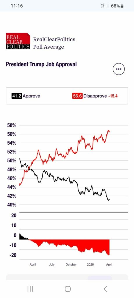 Dhe mungesa e një fitore të shpejtë në Iran po reflektohet në sondazhet e opinionit amerikan. Sot mesatarja e kuotave të Presidentit Trump është kthyer poshtë nivelit të dhjetorit – 56.6% e amerikanëve kanë vlerësim negativ, dhe vetëm 41.2% pozitiv….