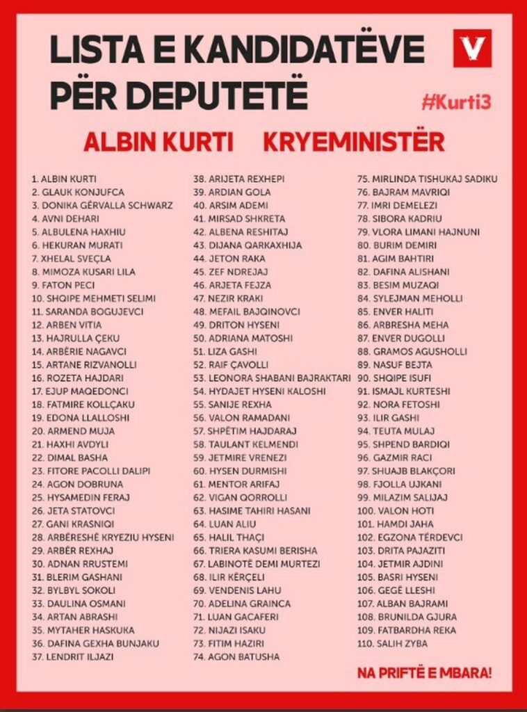 Në listë nuk figuron emri i ministrit të Infrastrukturës, një nga aktivistët më të hershëm të VV, Liburn Aliu. Po ashtu nuk do të garojë as Besnik Bislimi, zëvendëskryeministri i Kosovës.