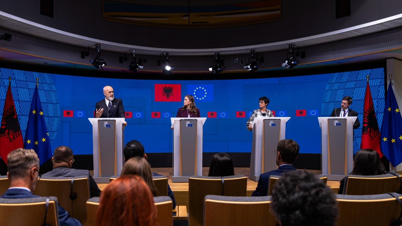 Kryeministri Edi Rama dhe Komisionerja Evropiane për Zgjerimin, Marta Kos mbajtën një konferencë për shtyp në Bruksel.