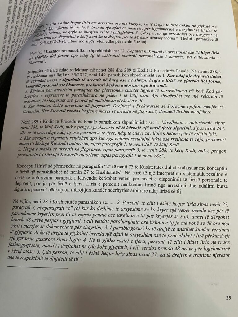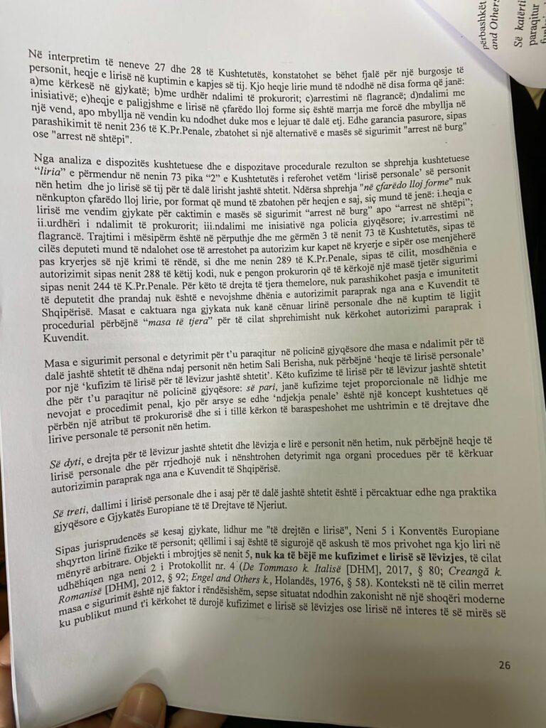 Nga analiza e dispozitës kushtetuese dhe e dispozitave procedurale rezulton se shprehja kushteronit “liria” e përmendur në nenin 73 pika “2” e Kushtetutës i referohet vetëm ‘lirisë personale’ së personit nën hetim dhe jo lirisë së tij për të dalë lirisht jashtë shtetit. Ndërsa shprehja “në çfarëdo lloj forme” nuk nënkupton çfarëdo lloj lirie, por format që mund të zbatohen për heqjen e saj, siç mund të jenë: i.heqja e lirisë me vendim gjykate për caktimin e masës së sigurimit “arrest në burg” apo “arrest në shtëpi”; ii.urdhëri i ndalimit të prokurorit; iii.ndalimi me inisiativë nga policia gjyqësore; iv.arrestimin flagrancë. Trajtimi i mësipërm është në përputhje dhe me gërmën 3 të nenit 73 të Kushtetutës, sipas të cilës deputeti mund të ndalohet ose të arrestohet pa autorizim kur kapet në kryerje e sipër ose menjëherë pas kryerjes së një krimi të rëndë, si dhe me nenin 289 të K.Pr.Penale, sipas të cilit, mosdhënia e autorizimit sipas nenit 288 të këtij kodi, nuk e pengon prokurorin që të kërkojë një masë tjetër sigurimi sipas nenit 244 të K.Pr.Penale. Për këto të drejta të tjera themelore, nuk parashikohet pasja e imunitetit të deputetit dhe prandaj nuk është e nevojshme dhënia e autorizimit paraprak nga ana e Kuvendit të Shqipërisë. Masat e caktuara nga gjykata nuk kanë cënuar lirinë personale dhe në kuptim të ligjit procedurial përbëjnë “masa të tjera” për të cilat shprehimisht nuk kërkohet autorizimi paraprak i Kuvendit.
