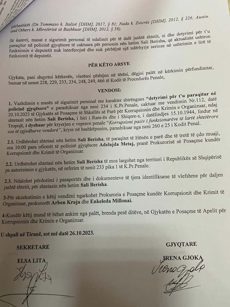Kujtojmë se ndaj Berishës është caktuar detyrimi i paraqitjes në gjykatë dy herë në muaj, si edhe i është ndaluar të udhëtojë jashtë territorit shqiptar.