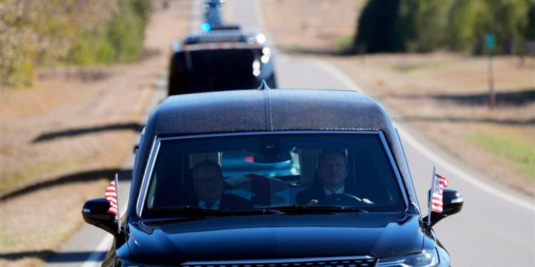 Ish-agjentët e Shërbimit Sekret që mbronin zotin Carter, ecën përkrah makinës së funeralit, ndërsa ajo dilte nga kampusi në rrugën për në qytezën Plains.